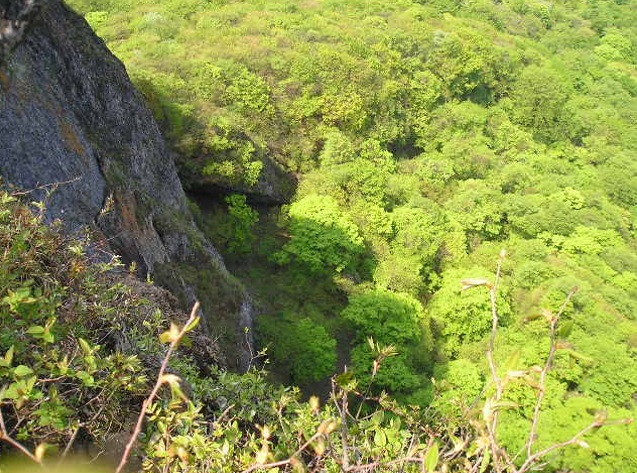 南側のトモ岩の肌が見えます。垂直みたいです。岩の上から下を見たいのですが、危ないのであまり端っこに行くわけにはいきません。岩をつかんで、離れたところから眺めました。
