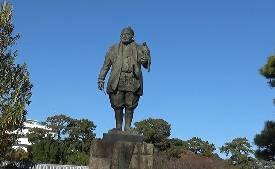 調査中の天守台跡を見に行こう。まずは徳川家康公の像を見ま