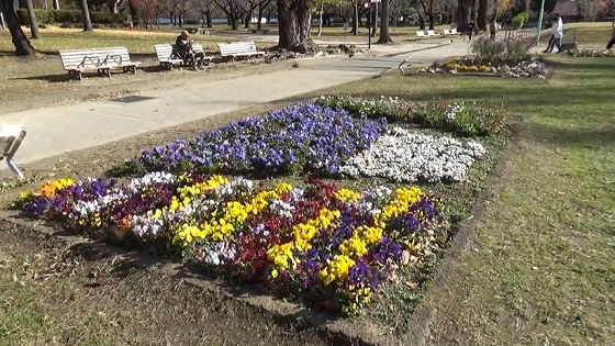 パンジーなどが咲いている花壇。青と白の花で富士山ができて