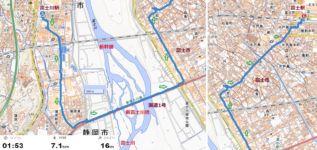 に富士駅到着。南口から2階へ。駅の案内地図で歩いた道を確認