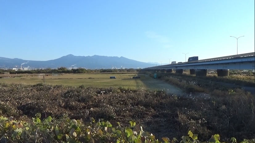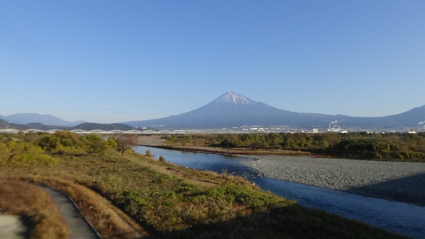 土手に上がると、富士山がよく見えました。広い河川敷の富士
