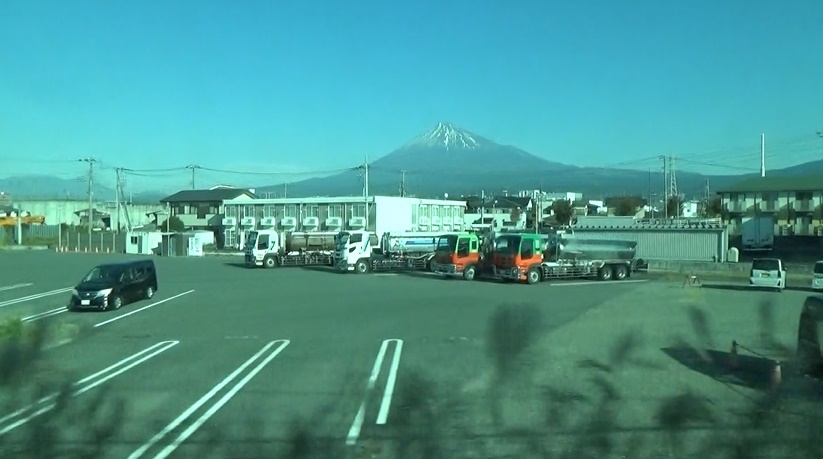 振り返ると工場の向こうに富士山。朝日が当たる新幹線を見て