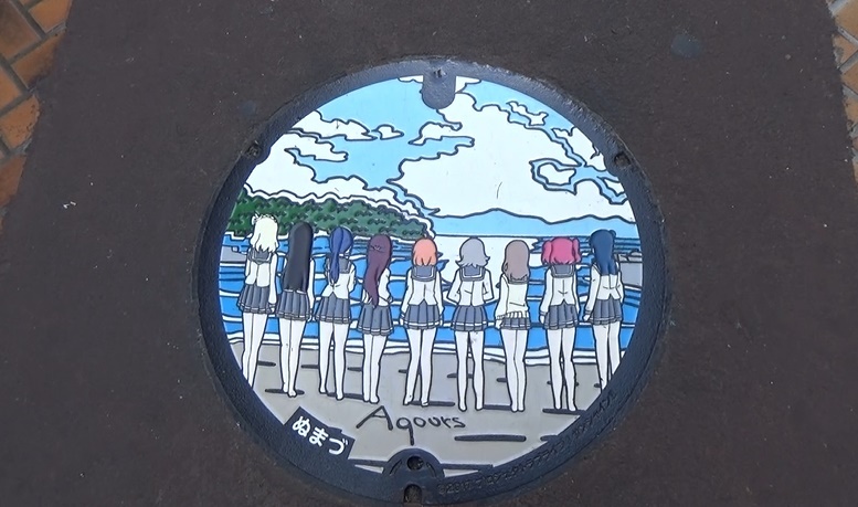 駅もそうでしたが、アニメのポスター、旗、マンホールなどい