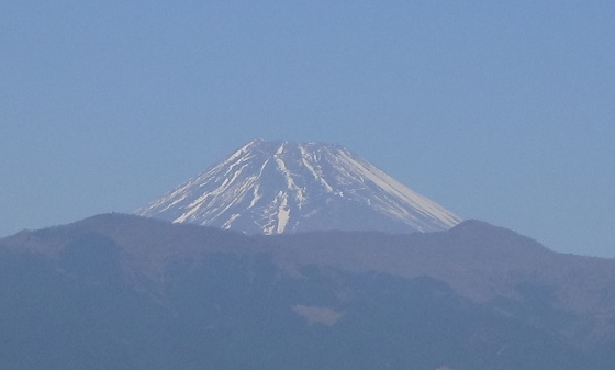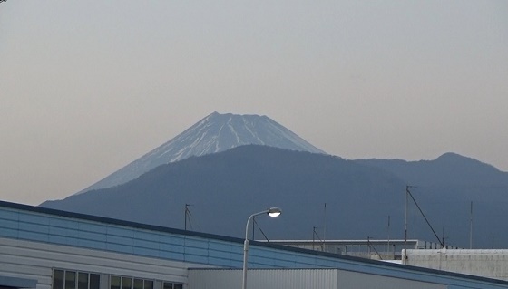 高いビルの間に富士山が見えます。ここからだと愛鷹山の上に