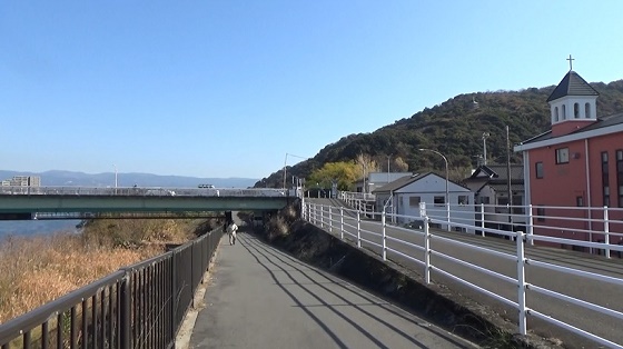 た。すでに平和塔が見えます。土手を歩きます。日が当たる川。