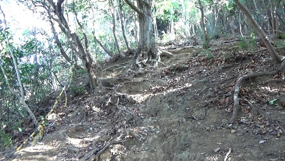 急坂だぁ。ロープがあるけど進みにくい。乾いてるから滑らな