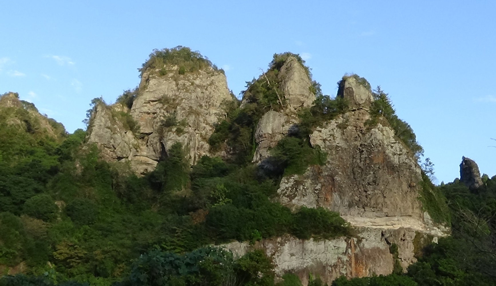 か。川そばから競秀峰を眺めました。よく晴れて明るすぎ。とて