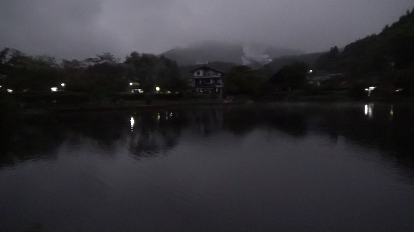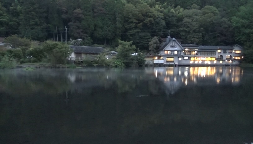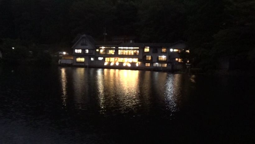 洋灯舎の灯りがめだちます。湖面に映ってよい雰囲気。由布岳