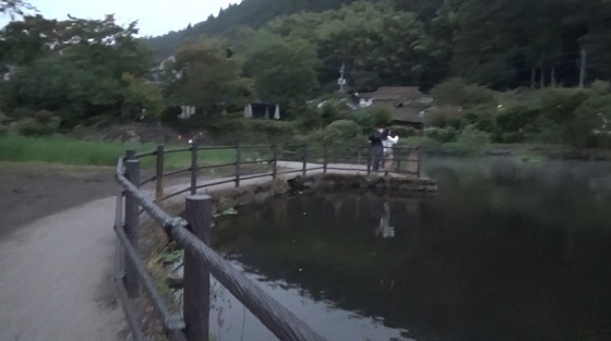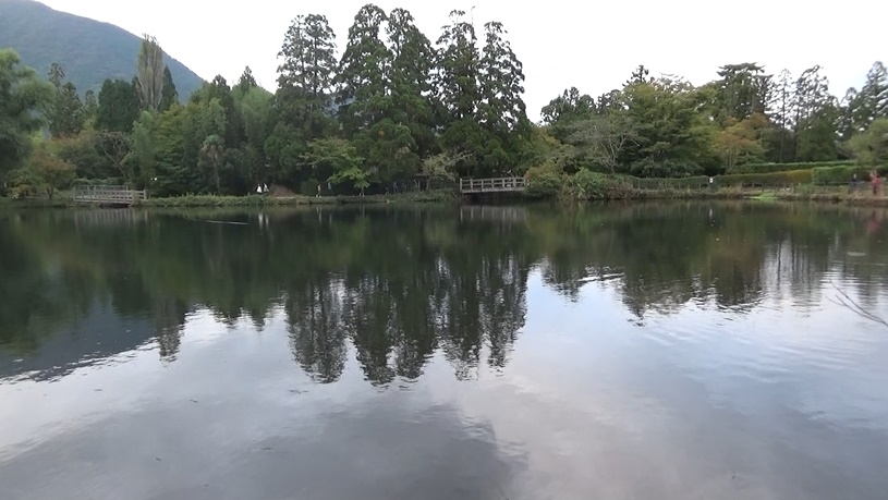駐車場を見ながら歩いていると金鱗湖に着きました。朝霧で有