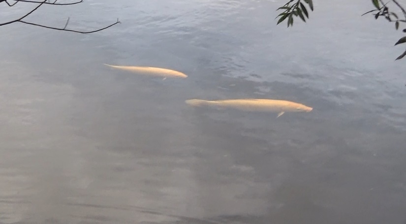 朝霧がないです。雲があるけど、南に山が見えています。鯉が