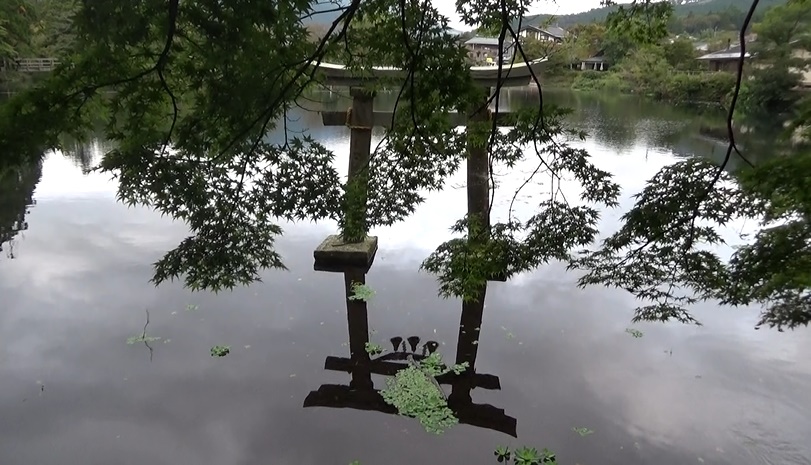 そして裏から金鱗湖を眺めました。水面に鳥居が出ています。
